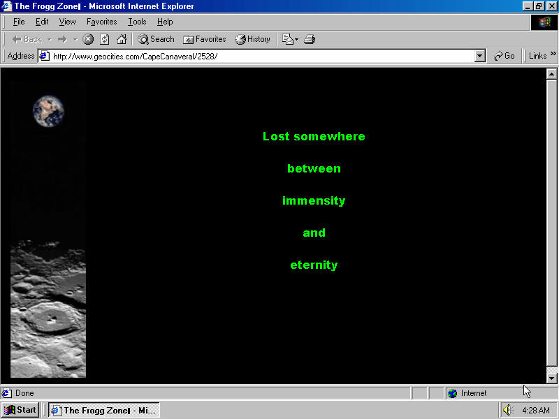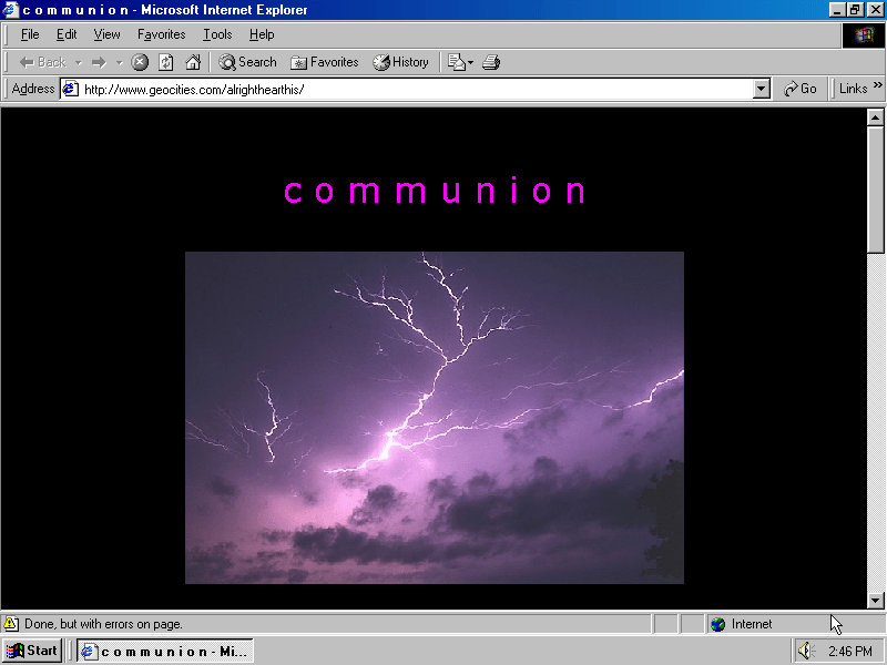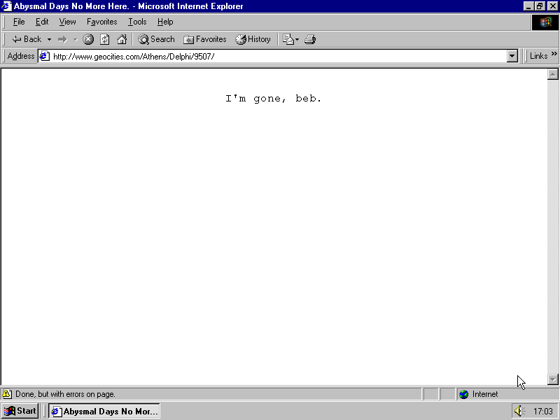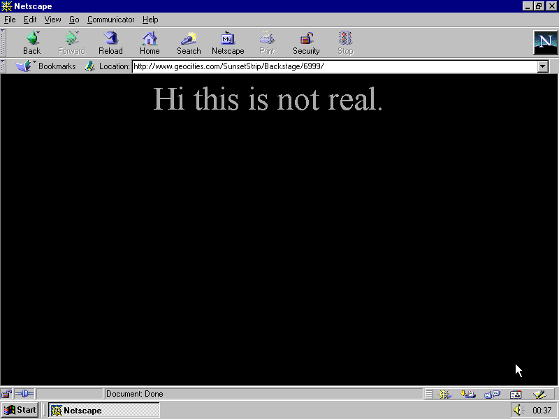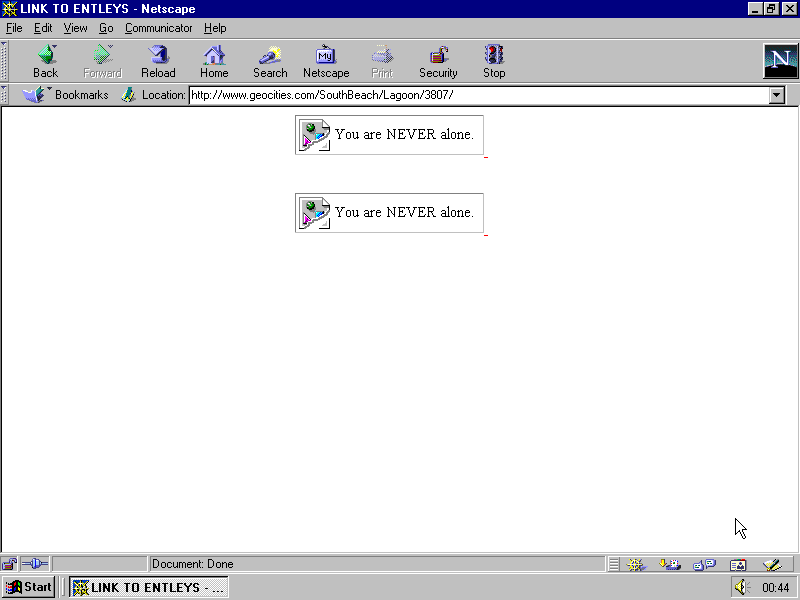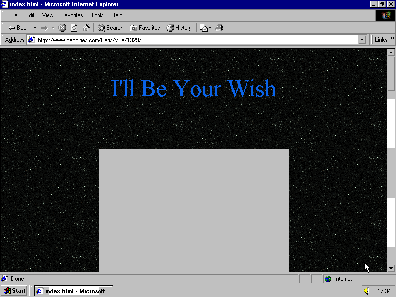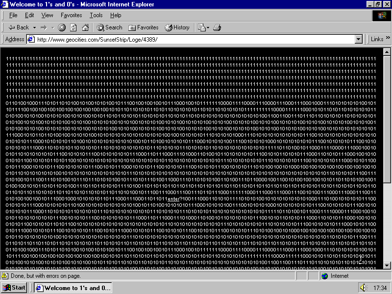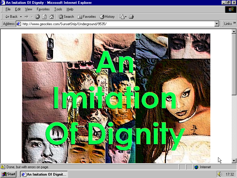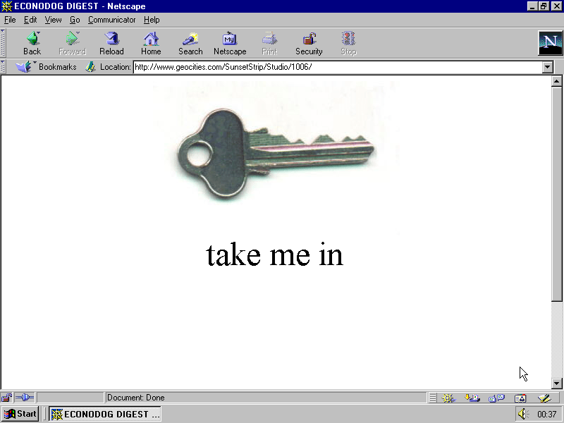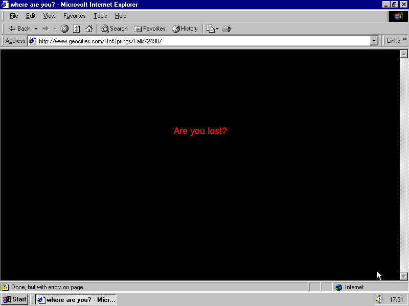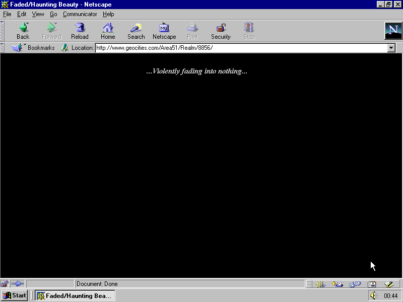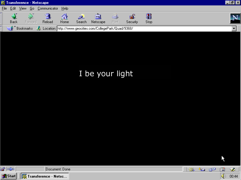 (This poem is assembled out of real Geocities web-pages, saved from oblivion by the Archive Team and rendered in era-appropriate web browsers by Olia Lialina and Dragan Espenschied for their project One Terabyte of Kilobyte Age. Just scroll down at your own pace.)