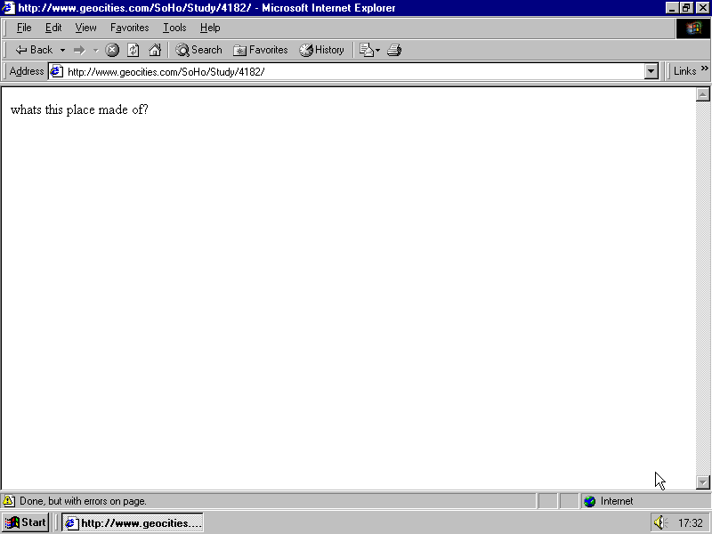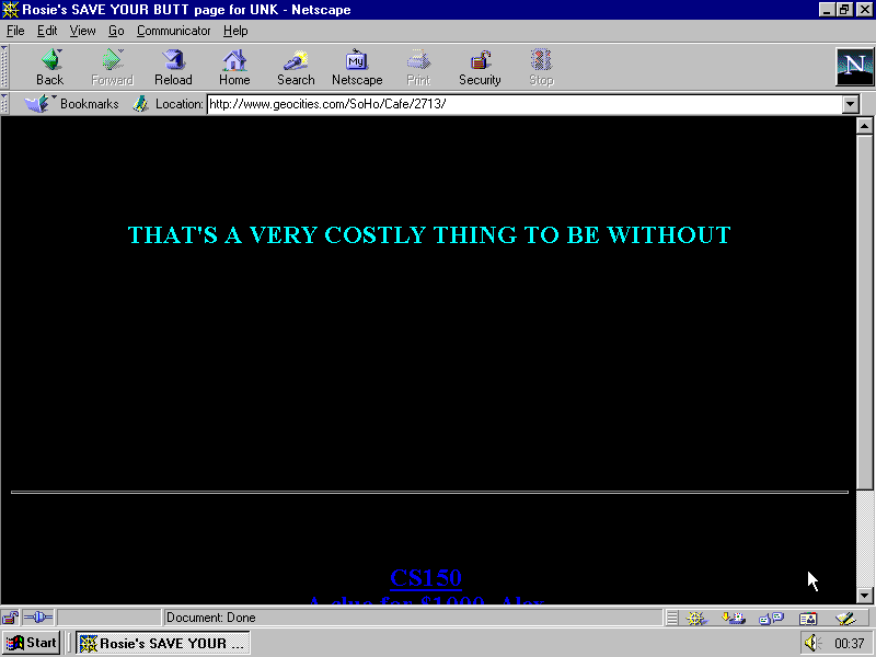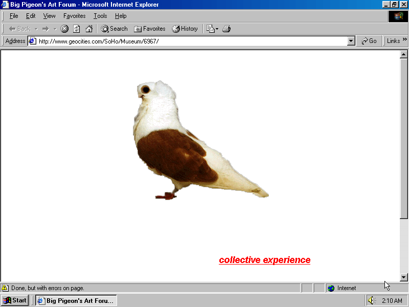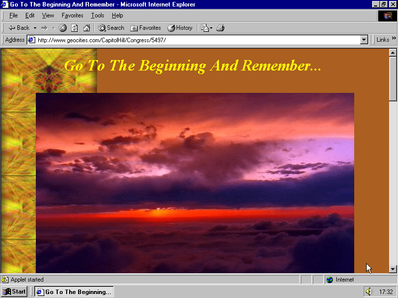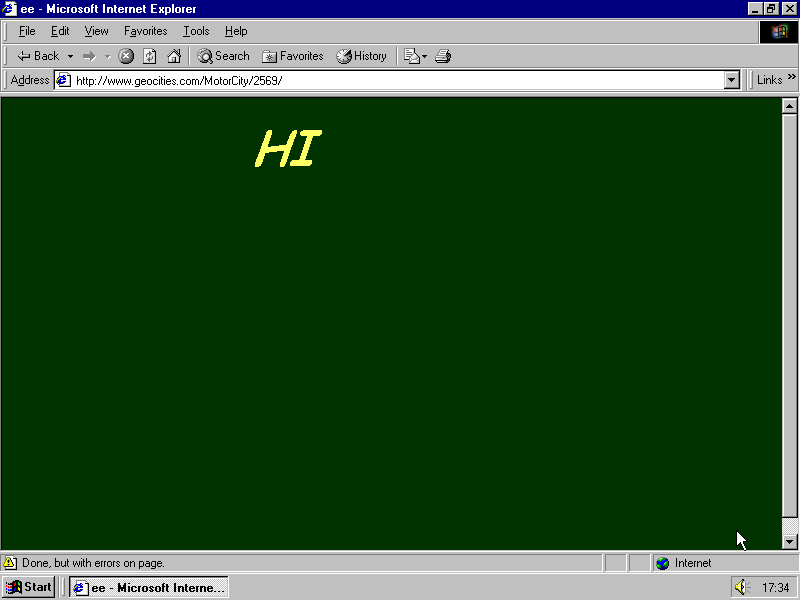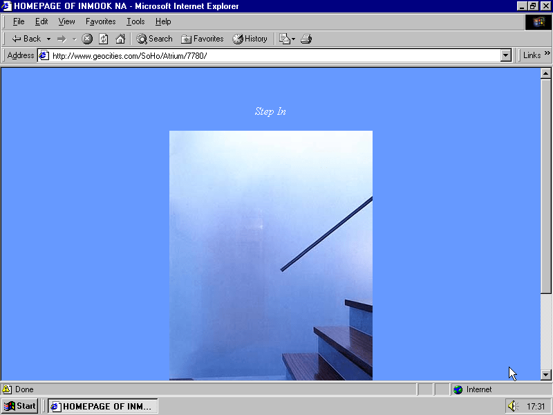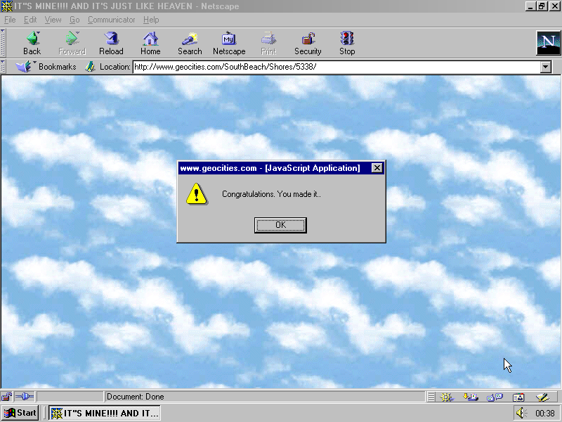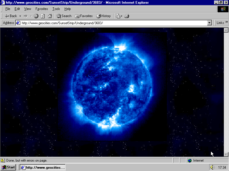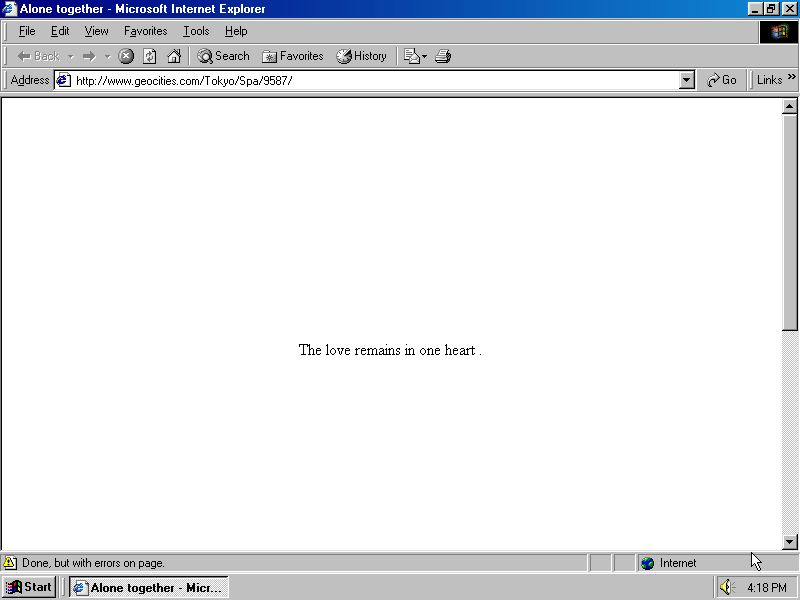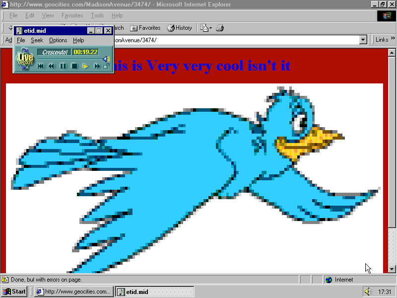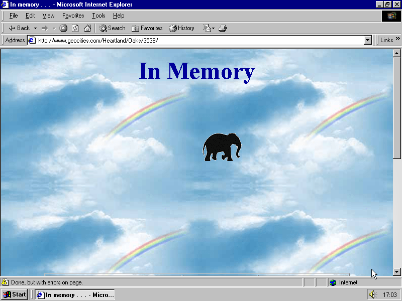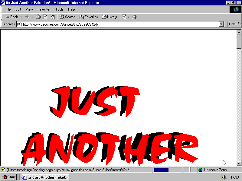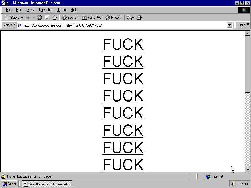 (This poem is assembled out of real Geocities web-pages, saved from oblivion by the Archive Team and rendered in era-appropriate web browsers by Olia Lialina and Dragan Espenschied for their project One Terabyte of Kilobyte Age. Just scroll down at your own pace.)